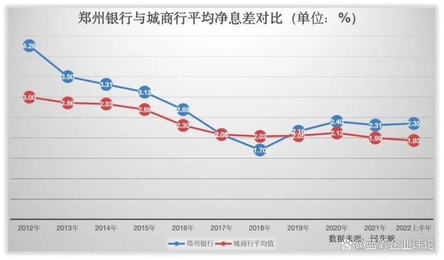 自2012年起,郑州银行的净息差【5】逐年下滑,2018年达到最低点;尤其是在2017年,跌破了行业平均净息差。2019年起有所好转,稍稍高于行业平均值,到2022年中期此数据分别为,2.16%、2.4%、2.31%、2.35%。
