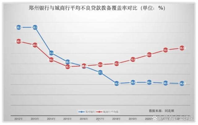 与高于行业均值的不良贷款率相对应的是,郑州银行的不良贷款拨备覆盖率【4】明显低于行业均值。两相叠加,可以看出郑州银行所面临的风险比前些年更大。