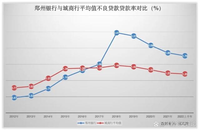 从不良贷款率【3】这一数据来看,Wind数据显示,郑州银行在2016年前后出现分水岭。2012年-2016年,这种银行这项数据分别为0.47%、0.53%、0.75%、1.1%、1.31%,均落后城商行平均值。