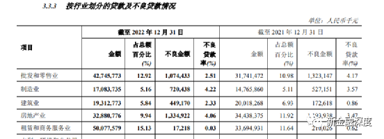 公司贷款中,该行不良贷款主要集中在房地产业、批发和零售业、制造业,不良贷款金额分别为13.35亿元、10.74亿元、7.2亿元,不良率分别为4.06%、2.51%、4.22%。