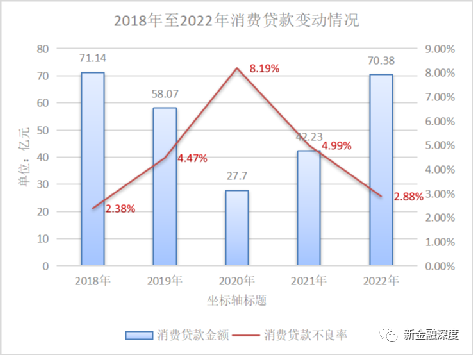 过去两年间,郑州银行个人消费贷款的质量有所好转。2021年、2022年不良贷款率依次为4.99%、2.88%。同时消费贷款规模有所回升,依次为42.23亿元、70.38亿元,逼近2018年末的水平。