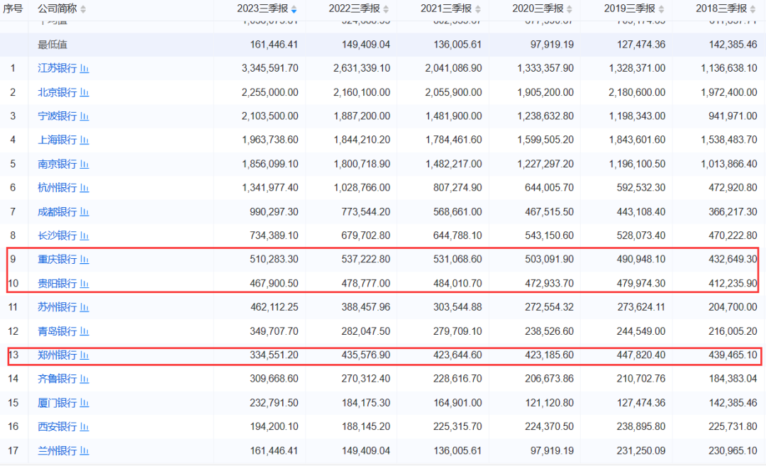 前三季度净利润27.51亿元,同比下降19.18%,在上述城商行里垫底。另外重庆银行、贵阳银行的净利润同比也下滑了,分别为-5.01%、-2.27%。