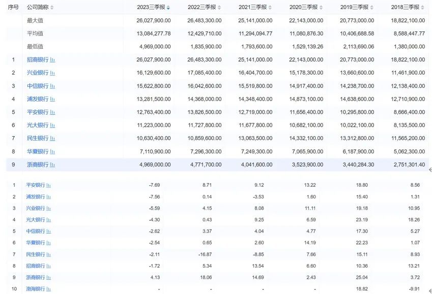 其余的光大银行、华夏银行、招商银行、平安银行、中信银行、浙商银行前三季度净利润都有不同程度增长,蜜妹看了下,除了浙商银行,其他银行增速均低于去年同期。