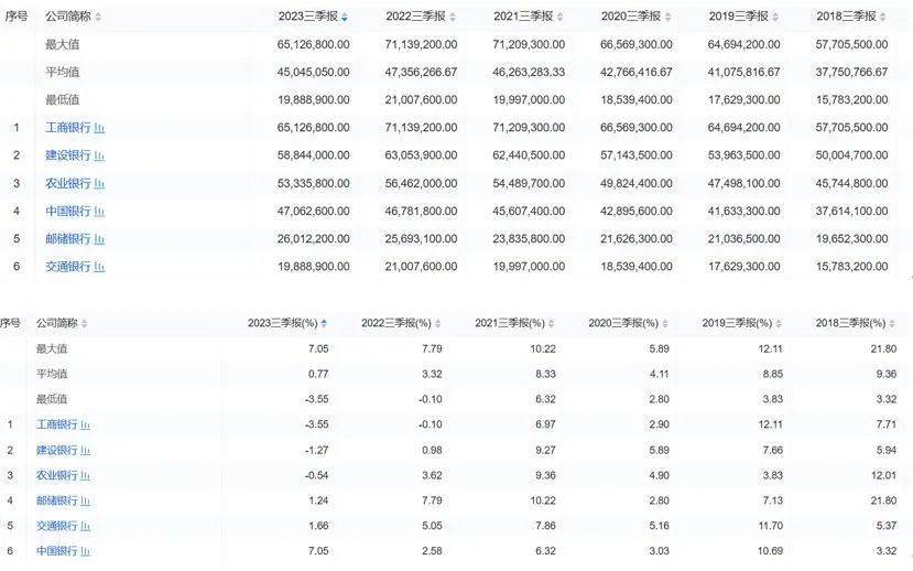 邮储银行增速也降得厉害,从去年同期的14.05%降到今年三季度的2.48%。建设银行、中国银行、农业银行增速则有小幅下降,从上年三季末的5.81%、5.02%、5.30%分别降到今年的3.15%、3.55%,5.22%。