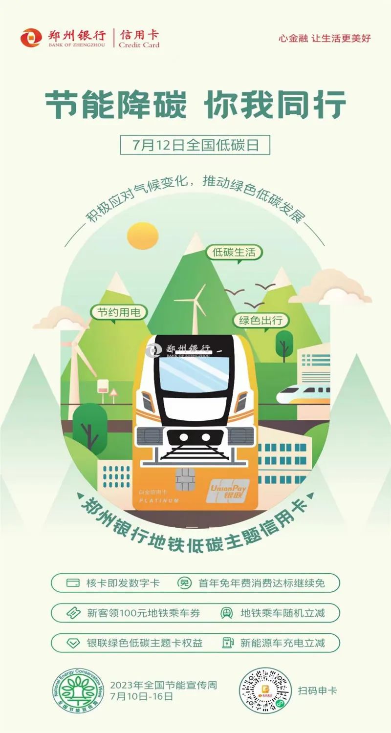 地铁低碳信用卡是郑州银行结合地铁场景为客户打造的首款绿色低碳主题信用卡,该产品为持卡人提供全方位的低碳出行优惠,满足广大市民绿色出行需求,并通过绿色消费、知识问答、趣味游戏等活动倡导低碳、环保、健康的生活方式。在品牌宣传上,郑州银行将2023年全国节能宣传周及全国低碳日主题与地铁低碳卡权益活动相融合,践行“生态优先,绿色发展”绿色金融理念,为如期达成“双碳”目标提供有力支撑。