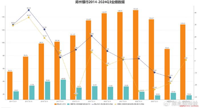 近日,郑州银行(002936.SZ)发布了其2024年度业绩快报。数据显示,郑州银行去年营收连续两年下滑,净利润更是连续三年下滑,在其他城商行发展都如火如荼的时候,郑州银行如此拉跨的成绩让投资者大失所望。