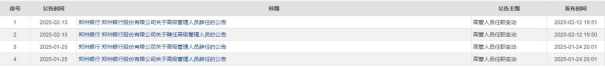 2024年以来,郑州银行经历了多轮高管调整,而在2025年年初,高管变动较为频繁。