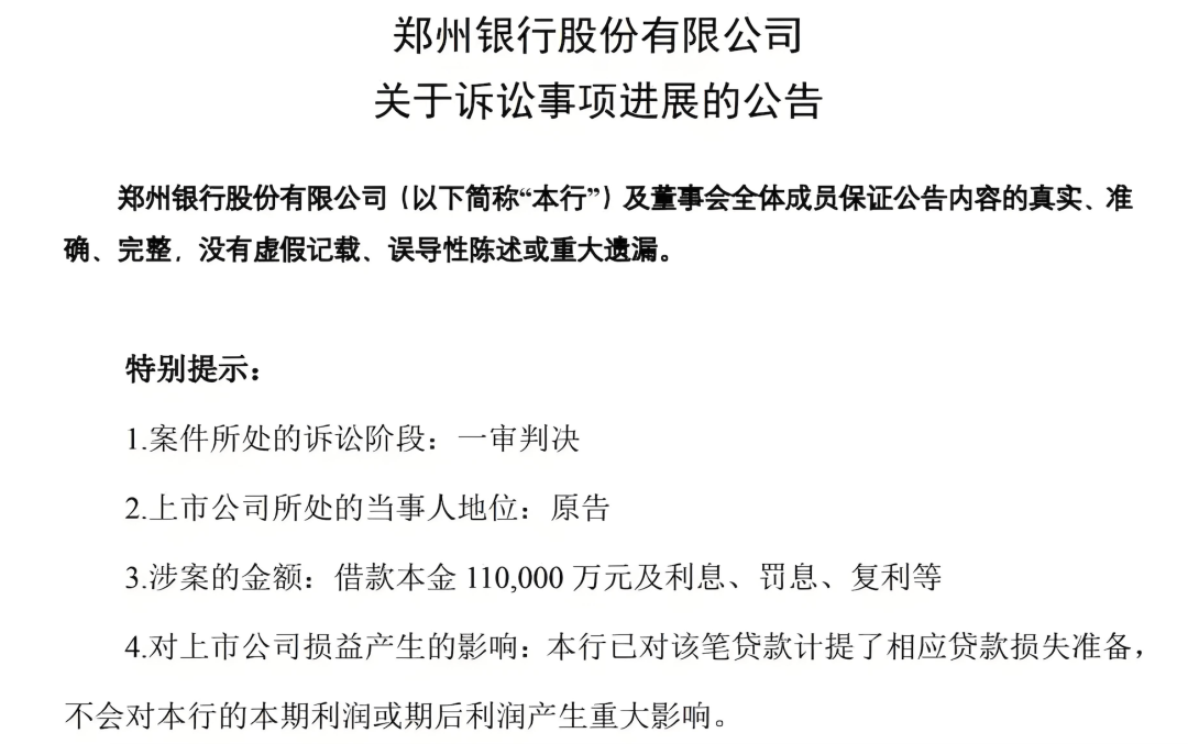 2025年12月31日,郑州银行发布公告称,法院一审判令被告郑州金威实业判决生效后10日内支付借款本金11亿元及相应利息、罚息、复利;同时,多家公司及相关自然人需承担连带清偿责任。