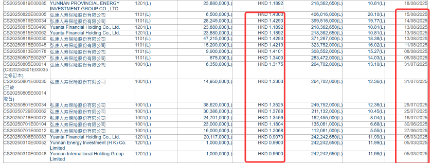 2025年6月27日,弘康人寿以每股1.2068港元增持1600万股郑州银行H股,耗资1930.88万港元,持股比例从4.75%升至5.55%,首次触发举牌。最大的一笔是2025年8月13日,增持了4712.5万股,斥资6748.44万。