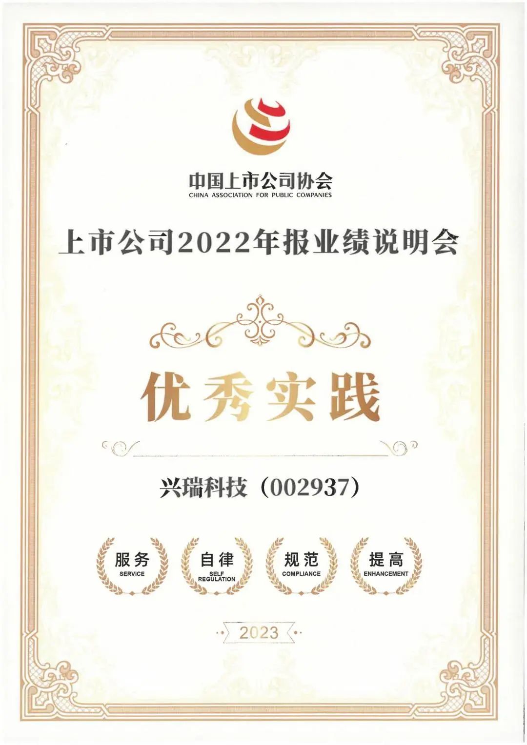 11月29日,中国上市公司协会举行上市公司2022年报业绩说明会最佳及优秀实践发布活动。兴瑞科技成功入选“2022年报业绩说明会优秀实践”。