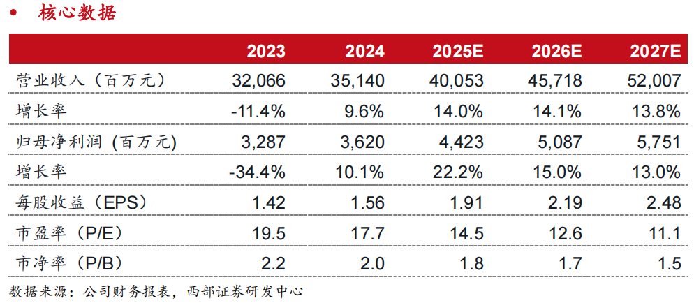公司是PCB行业龙头企业,积极扩展AI服务器/汽车业务,成长动力充足。我们预计鹏鼎控股2025-2027年营收分别为400.53、457.18、520.07 亿元,归母净利润分别为44.23、50.87、57.51亿元。我们持续看好公司未来业务拓展以及业绩增长,维持“买入”评级。