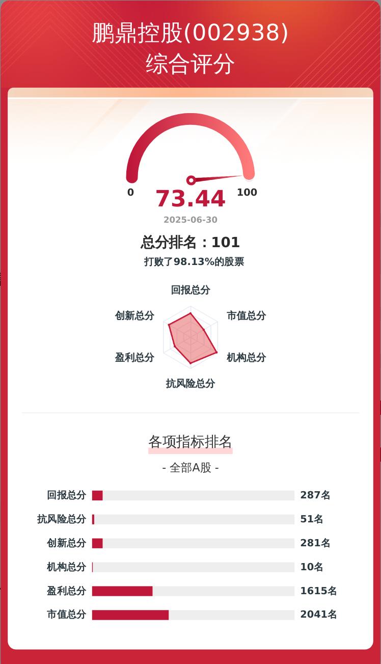 金融界上市公司研究院构建了一套上市公司韧性评价体系,从企业盈利、科技创新、股东回报、经营抗风险、市值表现及机构吸引力六个维度对企业进行量化评分,满分为100分。鹏鼎控股的韧性评价总分为73.44分,在A股5405家可比上市公司中排名第101位。