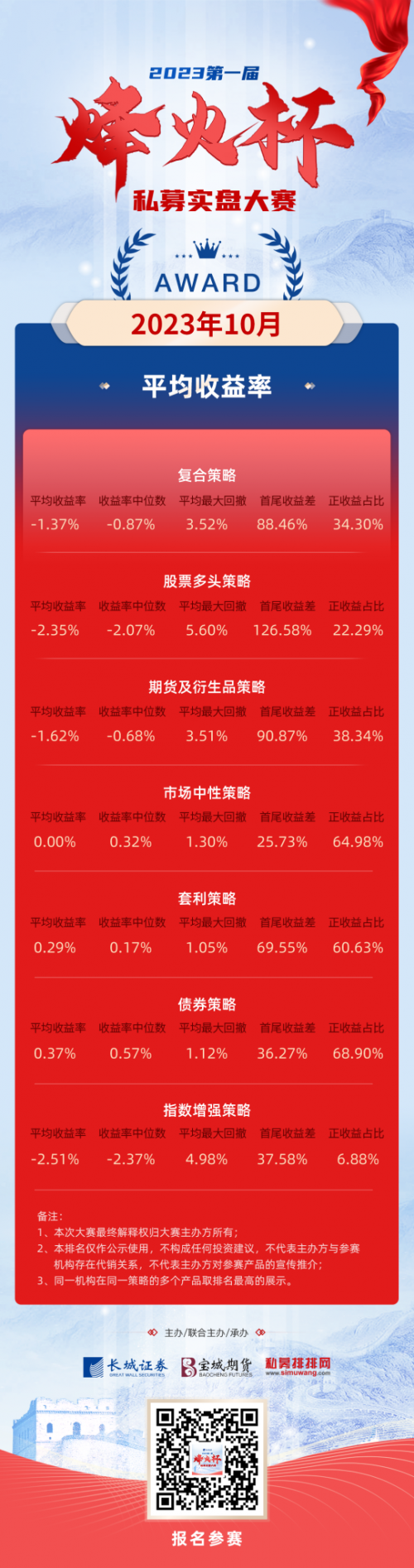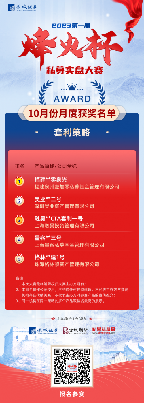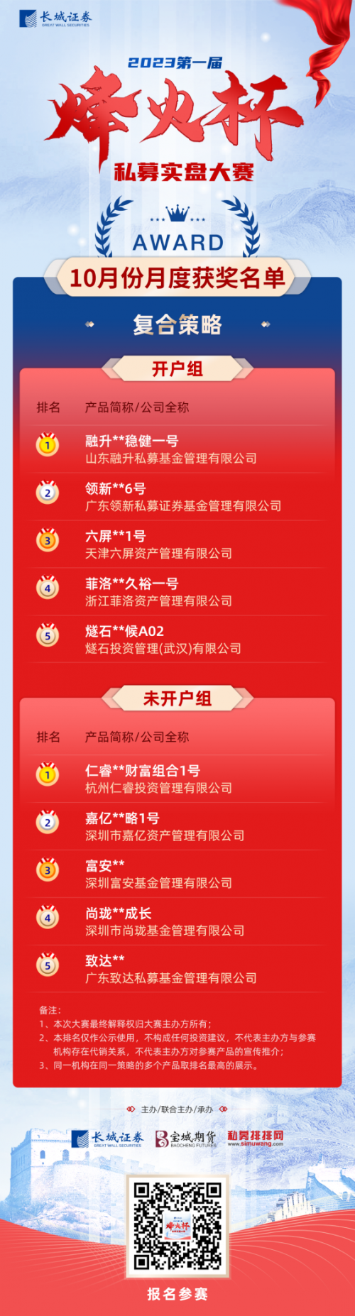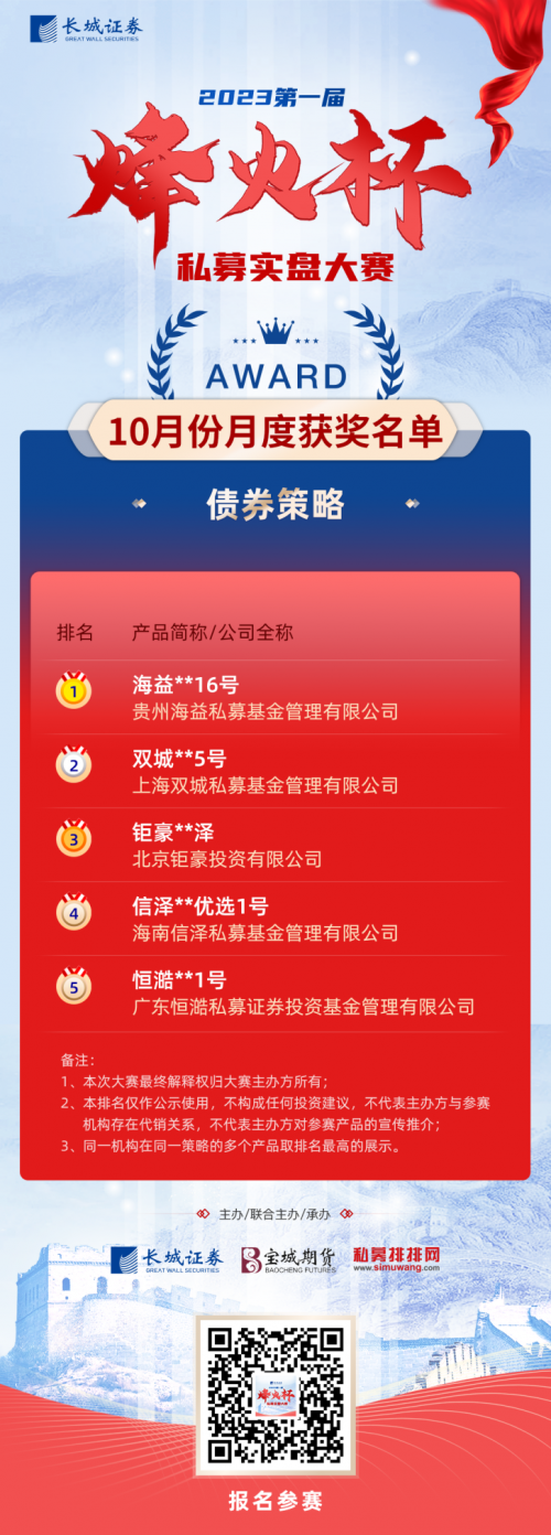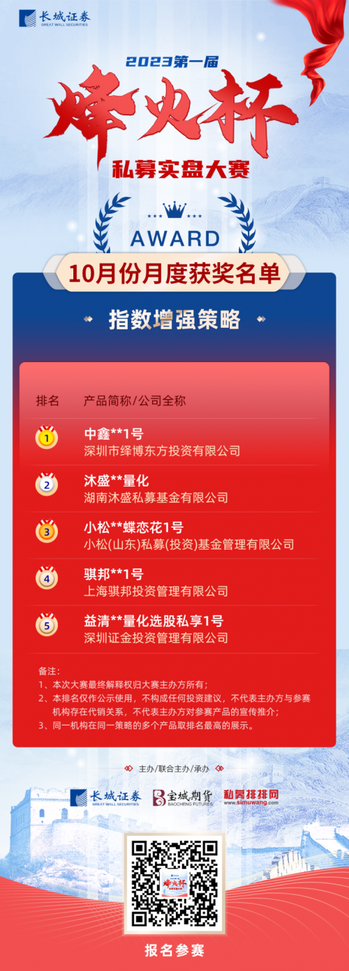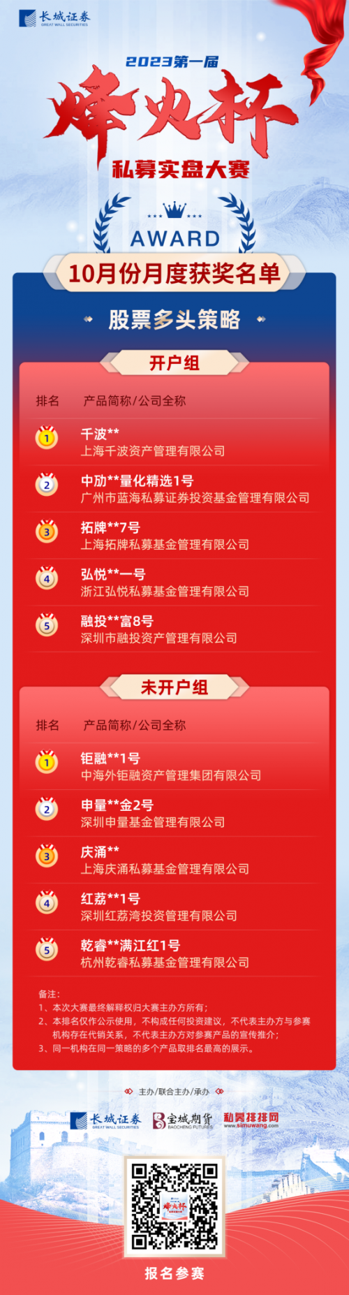 为挖掘更多优秀私募,持续为私募管理人提供投资交流和能力展示的平台,2023长城证券第一届“烽火杯”私募实盘大赛于今年5月重磅推出。本次大赛由长城证券主办,宝城期货联合主办,卡方科技、宽睿科技等机构协办。