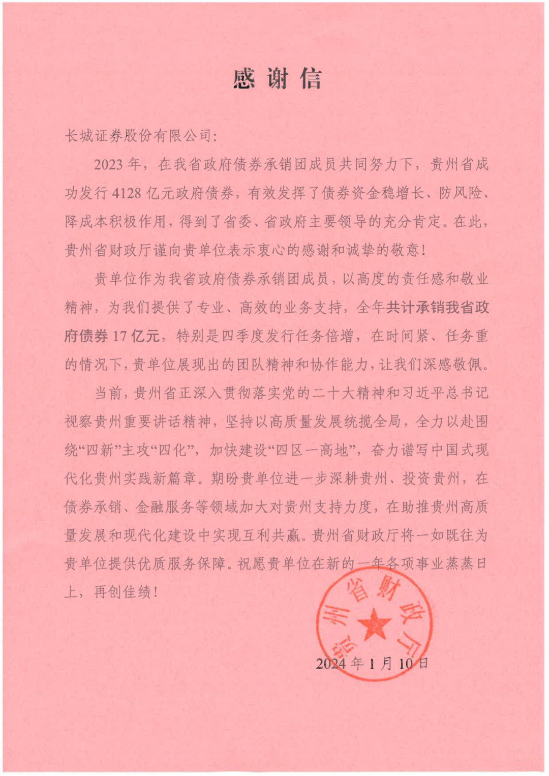2023年长城证券积极参与贵州省地方政府债券承销,为进一步提升贵州高质量发展水平、确保重大项目顺利实施、促进有效投资增长及积极应对和化解债务风险作出了积极贡献,为此贵州省财政厅特发来感谢信,向公司表示衷心的感谢!