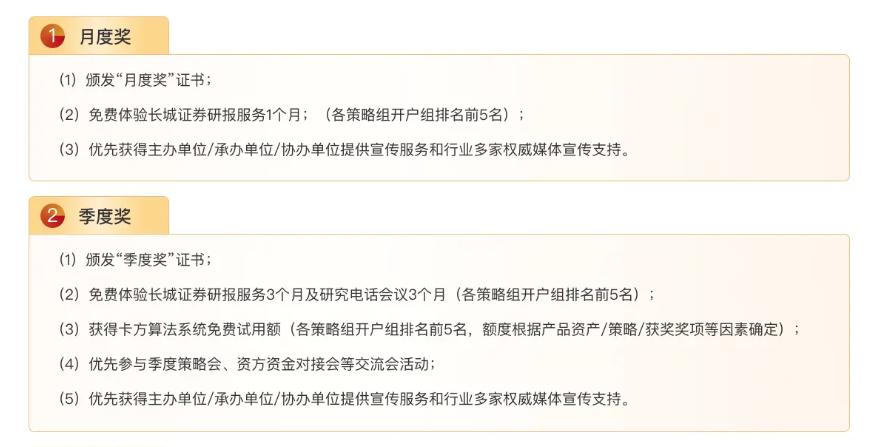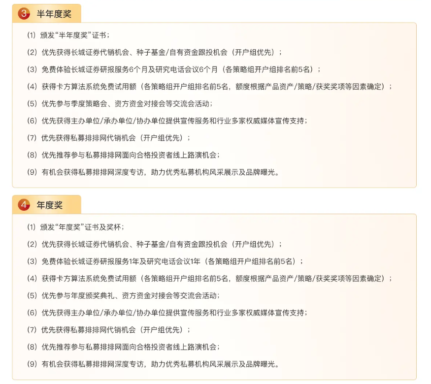 针对月度奖、季度奖、半年度及年度奖获奖的私募机构,主办方长城证券还专门设置了丰厚的权益,具体获奖私募权益如下。