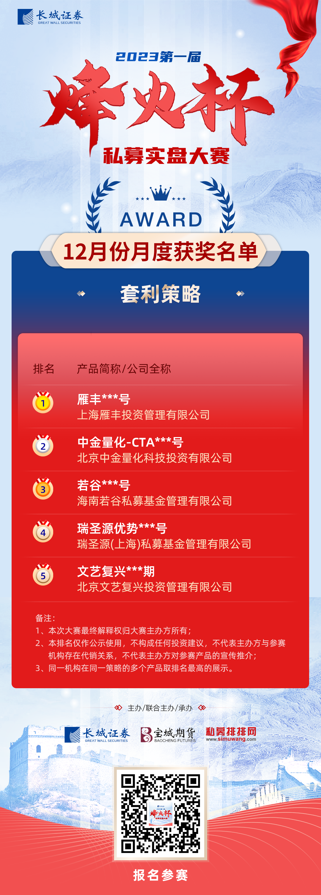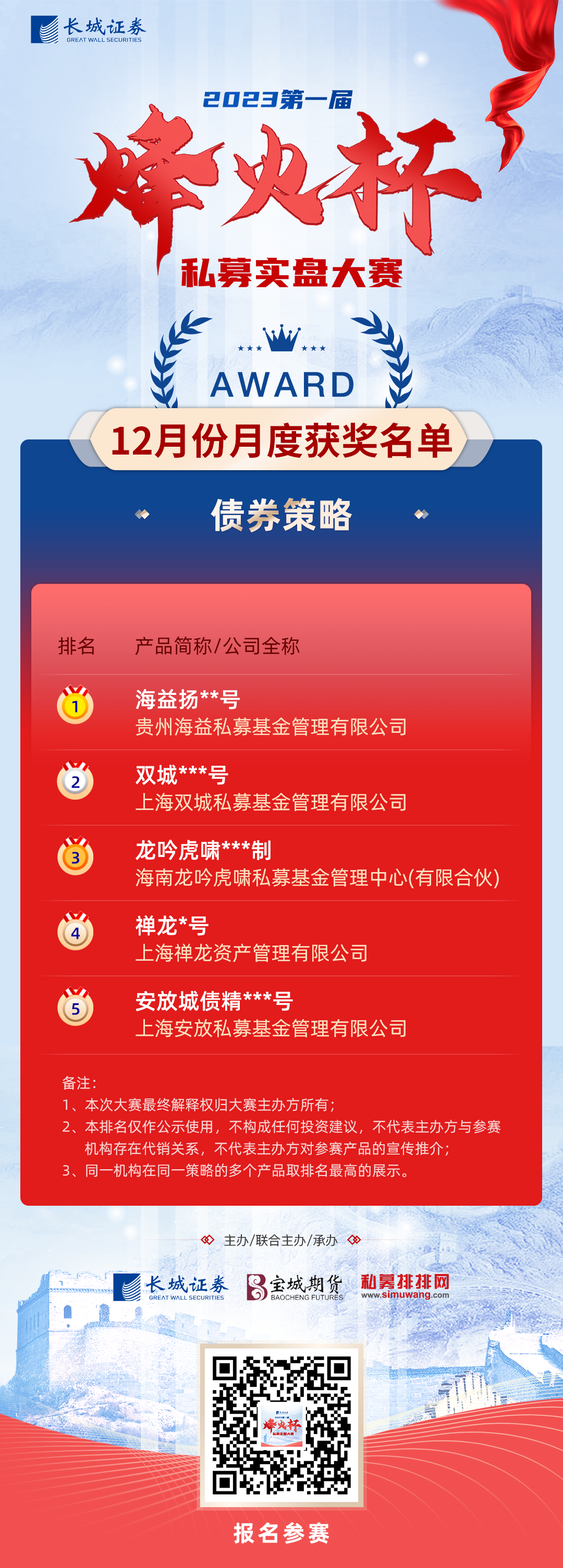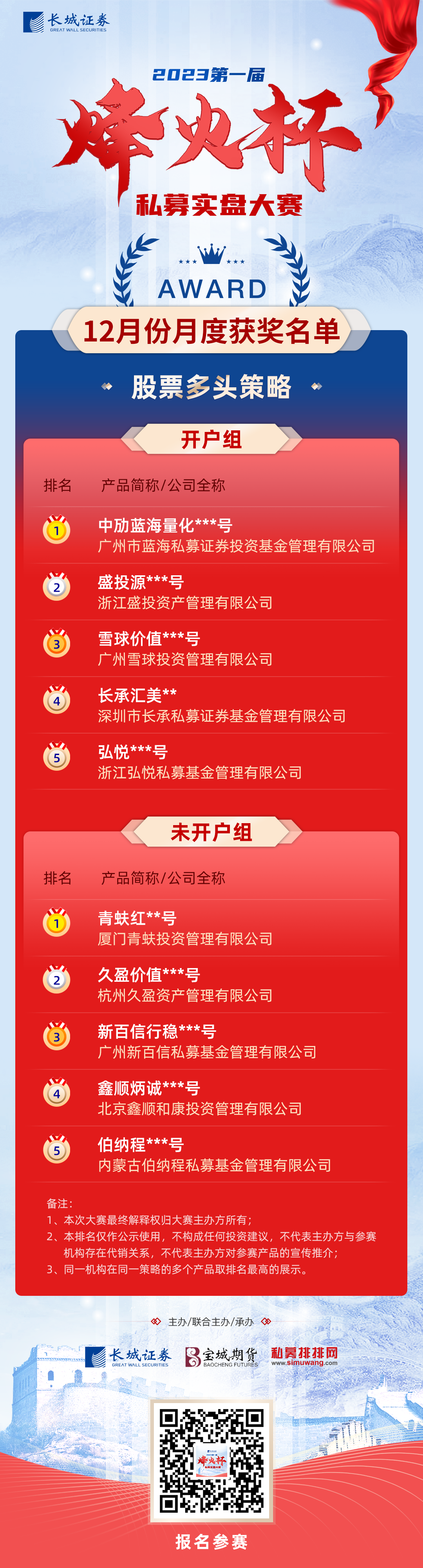 具体是哪些获奖私募管理人在12月赛程中凭实力摘金?以下为长城证券第一届“烽火杯”私募实盘大赛12月获奖名单。