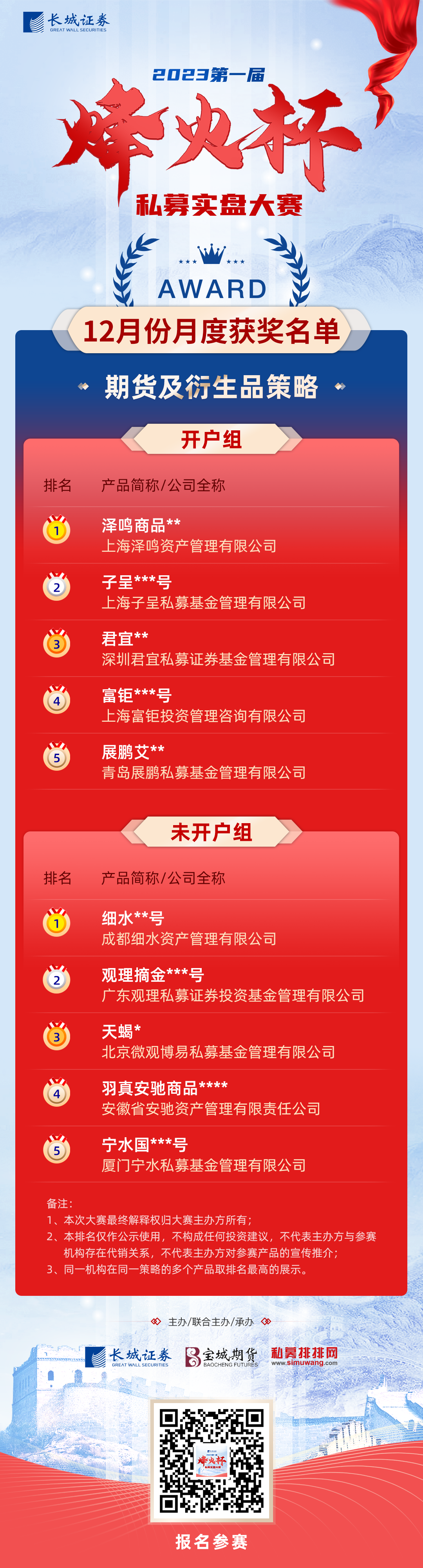 12月期货及衍生品策略开户组、未开户组冠军分别由上海泽鸣资产管理有限公司的泽鸣商品**、成都细水资产管理有限公司的细水**号摘得。