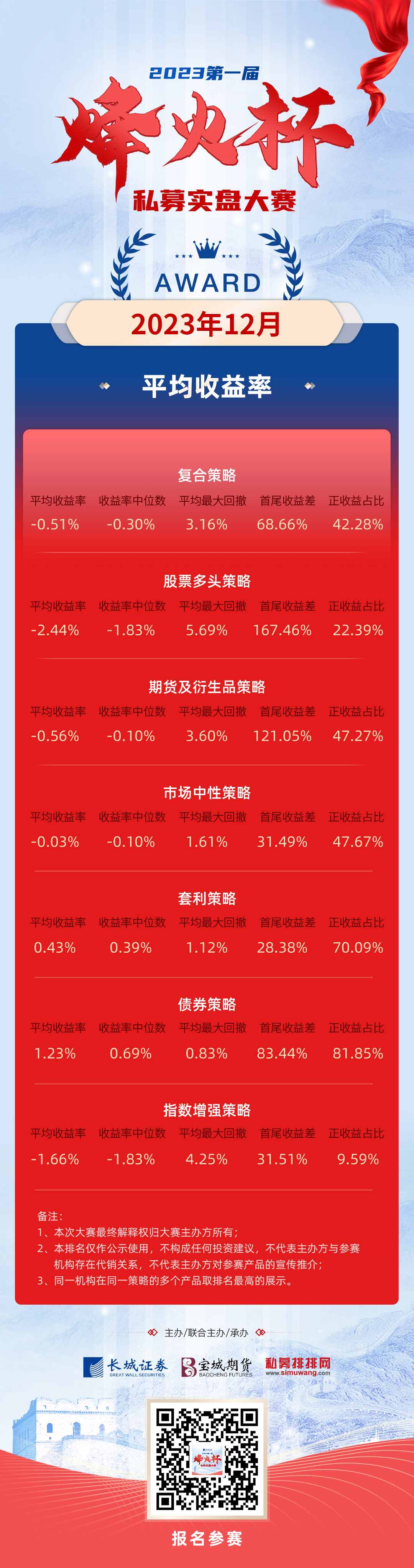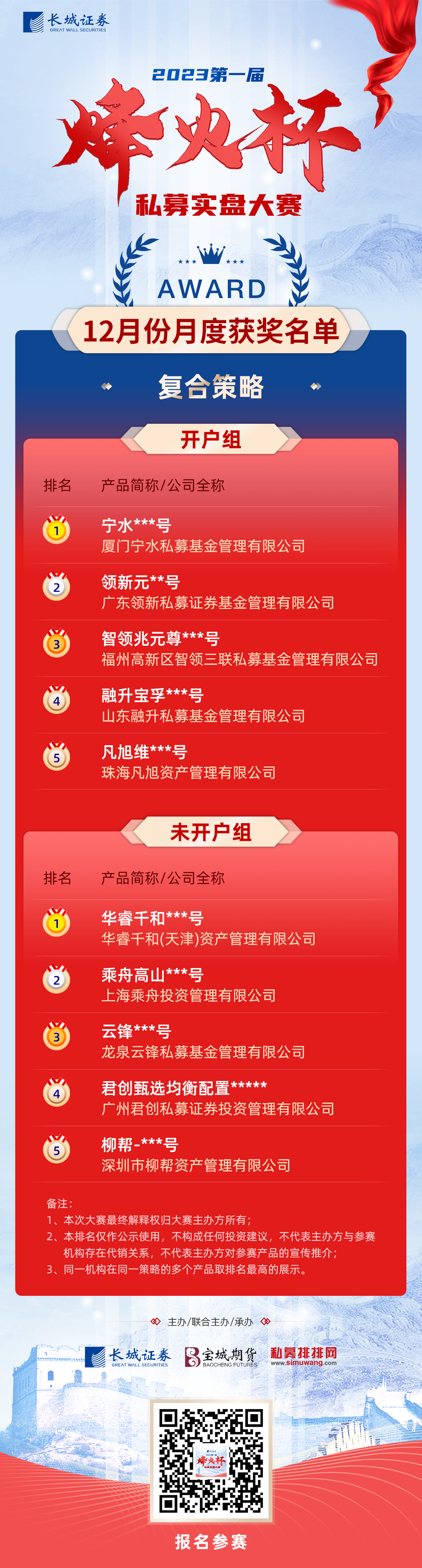 12月复合策略开户组冠军由厦门宁水私募基金管理有限公司的宁水***号摘得。未开户组冠军由华睿千和(天津)资产管理有限公司的华睿千和***号摘得。