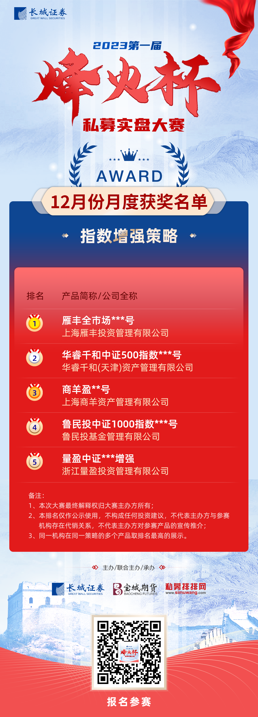 12月指数增强策略组冠军由上海雁丰投资管理有限公司的雁丰全市场***号摘得。