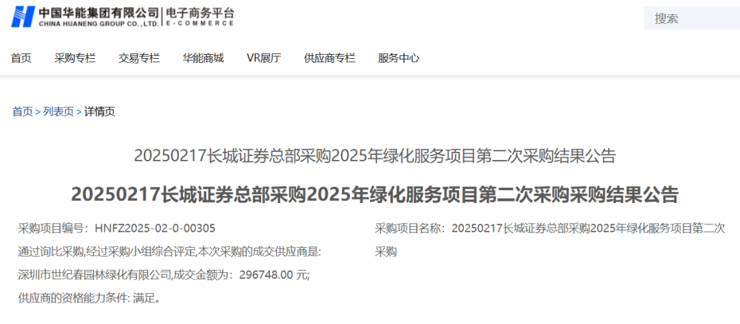 翻查中国华能官网,行家查到了这单名为“长城证券总部采购2025年绿化服务项目第二次采购”的原始公告。