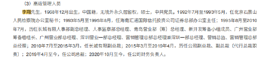 李翔先生,1968年12月出生,中国籍,无境外永久居留权,硕士,中共党员。1992年7月至1993年5月,任北京石景山人民检察院办公室秘书;1993年5月至1995年8月,任海南汇通国际信托投资公司证券总部办公室主任;1995年8月至2010年7月,历任长城有限人事部副总经理、人事监察部总经理、青岛营业部(筹)总经理、新开发筹备小组成员、广州营业部筹备组组长、广州营业部总经理、深圳营业一部总经理、营销管理总部总经理兼深圳一部总经理、营销总监、营销管理总部总经理;2010年7月至2015年3月,任长城有限副总裁;2015年3月至2019年4月,历任公司副总裁、副总裁(代行总裁职责);2019年4月至今,任公司总裁;2020年10月至今,任公司财务负责人。