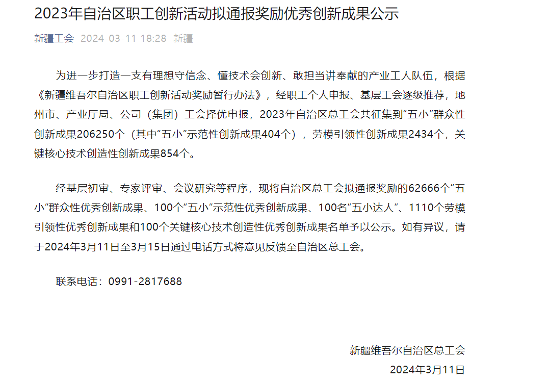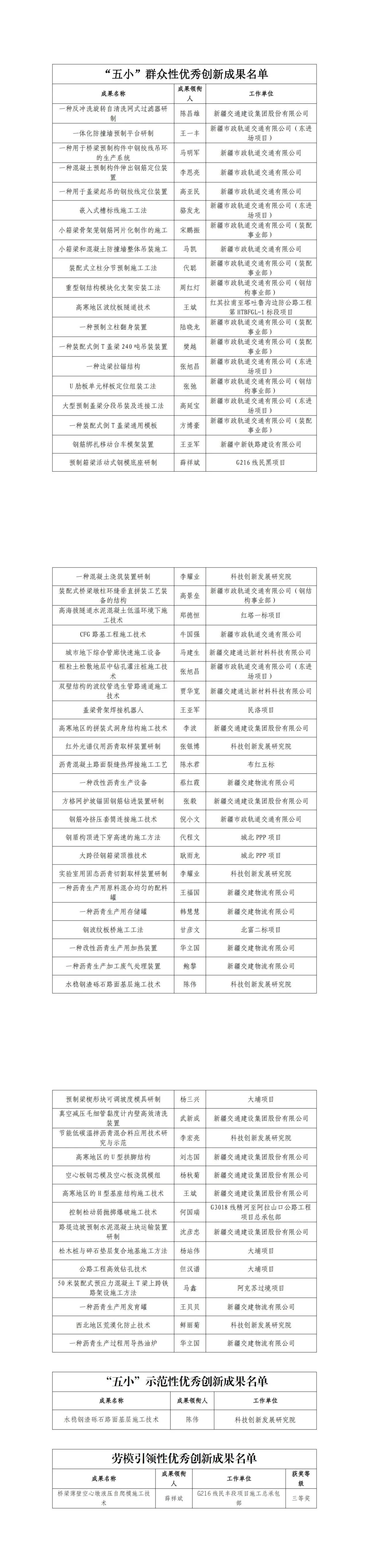 近日,自治区总工会发布《关于通报表扬2023年职工创新活动优秀创新成果的决定》,新疆交建喜获“五小”群众性优秀创新成果59项,“五小”示范性优秀创新成果1项,劳模引领性优秀创新成果1项(详见获奖清单)。