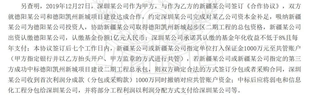 2019年12月27日,深圳某公司作为甲方,与作为乙方的新疆某公司签订《合作协议》,双方就德阳某公司和德阳凯州新城项目建设达成合作,约定深圳某公司完成对某乙公司资本金补足,吸纳新疆某公司为德阳某公司投资人,协助新疆某公司取得德阳凯州新城起步区二期工程的总包资格,新疆某公司出资认缴德阳某公司,认缴基金份额1亿元;深圳某公司承诺其认缴的基金年化收益不低于8%且每年支付;本协议签订后七个工作日内,新疆某公司或新疆某公司指定单位打入保证金1000万元至共管账户,若新疆某公司或新疆某公司指定的第三方成功中标德阳凯州新城项目建设二期工程总承包,则双方确定合法的方式签订分包或者采购合同,深圳某公司收到首次利润分成款(分包或采购款)1000万元的同时撤销对应共管账户资金;中标后应将弱电和信息化工程分包给深圳某公司,并将部分工程利润以利润分配方式支付给深圳某公司等。