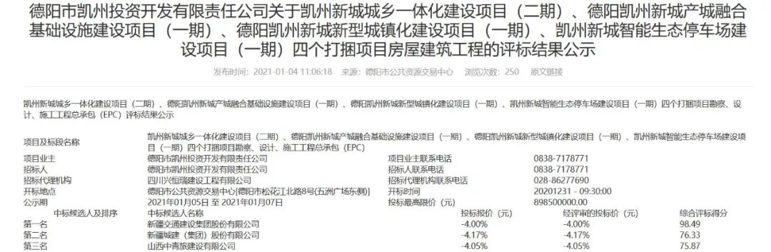 2021年1月4日,四川省公共资源信息网显示,新疆交建是第一名,综合评标得分是98.49分,领先第二名和第三名超过20分,公示期为2021年1月5日至1月7日。