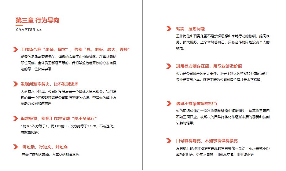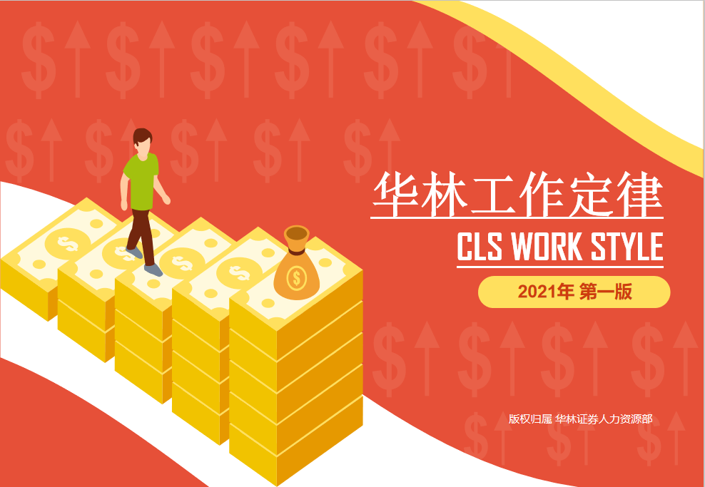 《华林工作定律》的首页展示了华林证券的三大核心价值观——忠诚、正直、专业。该核心价值观将渗透至公司的各个工作方面,形成凝聚力、向心力和执行力。华林工作定律给出了八条全新的行为导向,包括:工作场合称“老师、同学”,告别“总、老板、老大、领导”;发现问题不解决,比不发现还坏;追求极致,别把工作定义成“差不多就行”;讲短话、行短文、开短会;站高一层想问题;别用权力刷存在感,用专业创造价值;遇事不推诿做事有担当;口号喊得响亮,不如事情做得漂亮。
