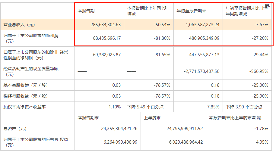 今年第三季度,该公司营业总收入同比下降50.54%至2.86亿元,归属于上市公司股东的净利润同比下滑81.8%至0.68亿元;基本每股收益同比减少78.57%至0.03元/股,加权平均净资产收益率为1.1%,同比下降5.49个百分点。