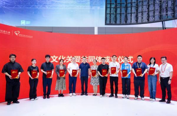 此外,活动同期举行“文化关爱共同体”成立仪式。深圳报业集团副总编辑陈迅、深圳市美术家协会主席陈湘波以及华林乡村振兴发展基金等12家成员单位代表共同揭牌。深圳市关爱办专职副主任陈建中表示:“期待更多社会力量加入,让文化成为普惠民生的温暖底色。”