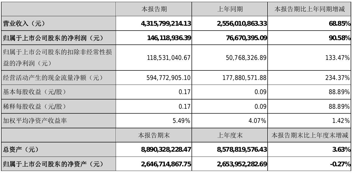 8月27日,新乳业(002946)近日发布2021年半年度报告,报告期内营业收入4,315,799,214.13元,同比增加68.85%;净利146,118,936.39元,同比净利增加90.58%。