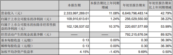 单季度来看,今年第三季度,新乳业实现营业收入23.34亿元,同比增长11.08%;实现归属于上市公司股东的净利润1.10亿元,同比增长1.24%;实现归属于上市公司股东的扣除非经常性损益的净利润1.02亿元,同比增长10.37%;基本每股收益为0.13元/股,与上年同期持平;加权平均净资产收益率为4.15%,比上年同期减少1.43个百分点。
