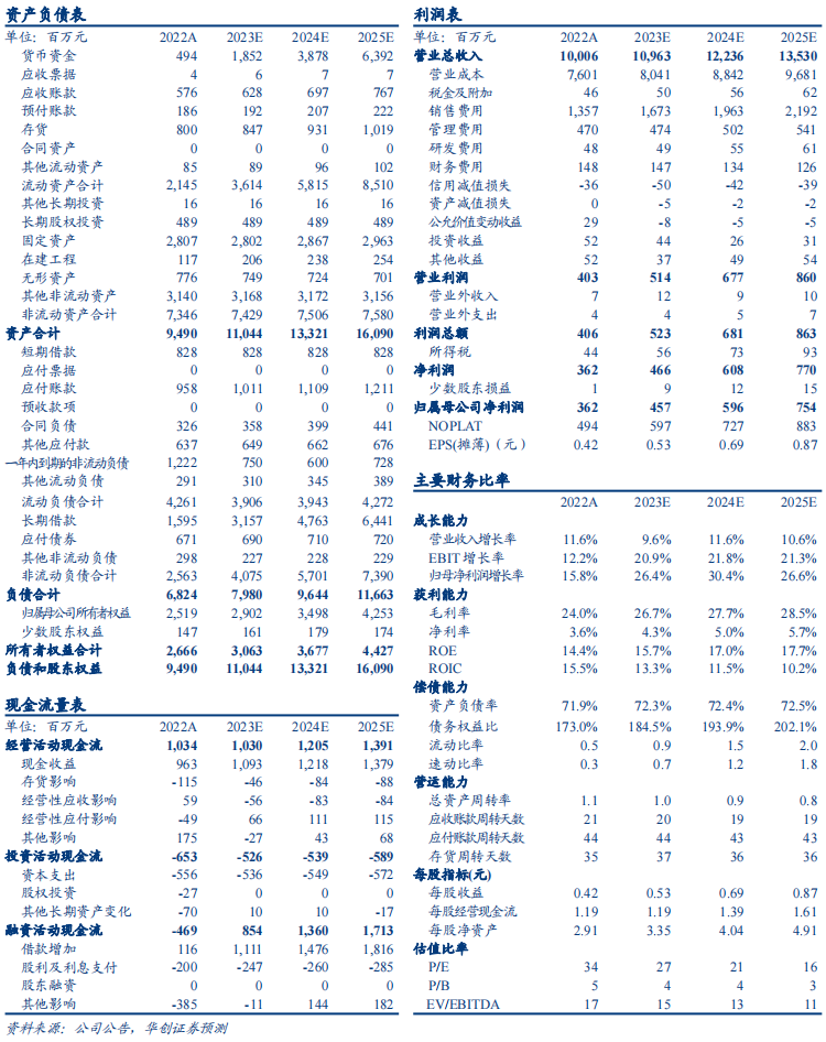 毛销差明显扩大,扣非利润再超预期。Q3公司毛利率为26.4%,同比+2.2pcts,主要原奶价格持续回落叠加结构优化影响,销售费用率为14.0%,同比+0.4pcts,旺季费投前置下费率增幅有所放缓,故Q3毛销差为12.5%、同比提升1.8pcts,环比进一步扩大。Q3管理/财务费用率为4.2%/1.0%,同比+0.1/-0.6pcts,财务费用率回落主要系公司偿还银行负债后利息降低影响。此外,公允价值变动损益/投资收益/资产处置收益占营收比重分别达0.40%/0.32%/-0.87%,同比-0.79pct/-0.34pct/-0.57pct,主要分别为利率掉期及货币掉期公允价值变动/联营企业重庆经营承压/淘汰牛只时牛价下行等因素影响,均进一步拖累公司盈利。故23Q3公司扣非净利率同比大幅提升1.7pct至5.6%,再超市场预期,而净利率则稳步提升0.5pct至5.0%。