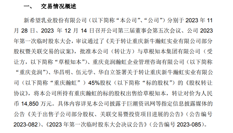2023年11月29日,新乳业发布一则股转公告,称“根据市场发展趋势判断和经营发展安排”,拟将旗下“一只酸奶牛”运营实体公司“重庆瀚虹”45%股权转让给草根知本集团有限公司(简称“草根知本”),45%股权作价为1.49亿元。