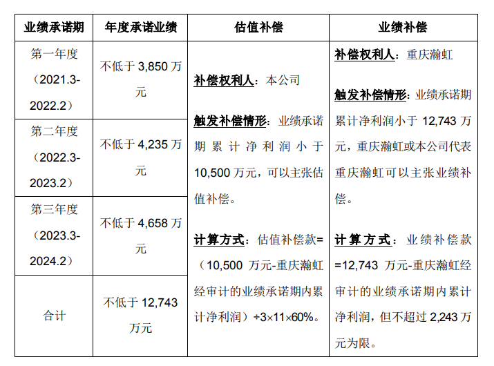 双方同时约定,在2021年3月1日至2024年2月29日的三年对赌期,重庆瀚虹在第一、二、三个年度的净利润分别不得低于3850万元、4235万元、4658万元,合计不得低于12743万元。