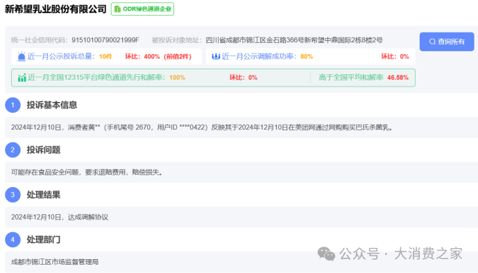 此外,根据全国12315消费投诉信息平台的数据,相关投诉达到61条,其中有消费者针对新乳业的巴氏杀菌乳提出了食品安全相关的投诉。并且新乳业对这些投诉进行了相应的赔偿,通过达成和解来解决此类问题。