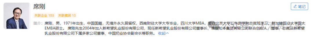 公开资料显示,席刚1971年出生,西南财经大学大专毕业,最低学历为大专。而后获得四川大学MBA、新加坡国立大学亚太EMBA硕士、上海高金-亚利桑那全球金融工商管理博士DBA,最高学历为博士。席刚2004年加入新希望乳业股份有限公司,并于2019年1月担任新乳业董事长。现任新乳业董事长、草根知本总裁、中国奶业协会副会长等多个职务。