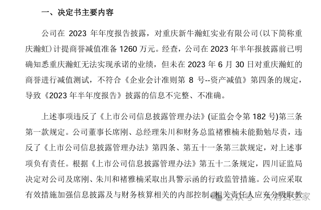 事件起因是新乳业2023年半年报信息披露不准确。相关信息显示,新乳业在2023年半年度报告披露之前已经知晓重庆瀚虹无法达成预期业绩,却未在2023年6月30日对重庆瀚虹的商誉进行适当的减值测试,不符合企业会计准则对资产减值的规定。而其在2023年报对该公司计提了1260万元的商誉减值损失。