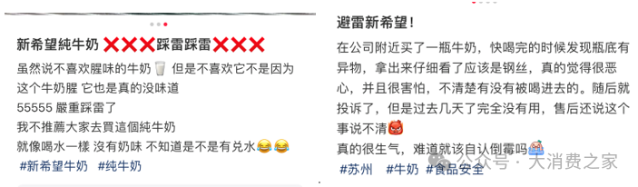 在新乳业积极通过并购扩张的同时,其产品品质问题也引起了公众的关注。根据某社交分享平台上的用户反馈,新乳业的产品存在一些质量问题。有消费者指出,该品牌的纯牛奶缺乏应有的奶味,疑似掺水。同时,也有消费者反映在牛奶中发现了钢丝等异物。