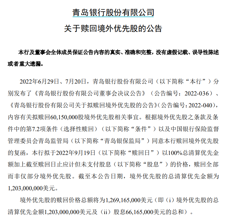 7月30日,青岛银行发布了赎回境外优先股的公告。公告显示,青岛银保监局已同意该行在2022年9月19日全部赎回境外优先股,赎回总额将为12.69亿美元。