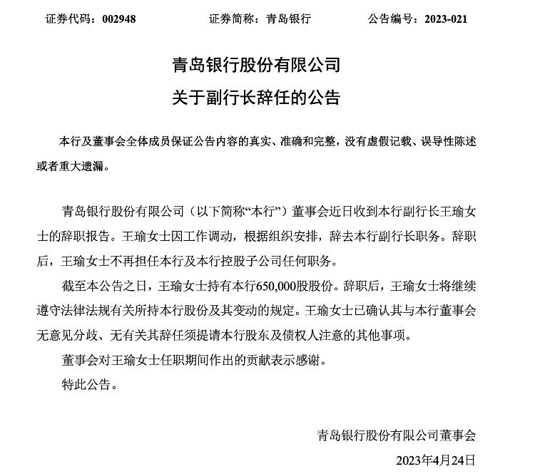 青岛银行(002948)发布公告称,公司董事会近日收到副行长王瑜的辞职报告。其因工作调动,根据组织安排,辞去青岛银行副行长职务。辞职后,王瑜不再担任公司及公司控股子公司任何职务。截至公告发布之日,王瑜持有青岛银行65万股股份。与此同时,公司发布了补位人选,青岛银行董事会同意聘任张猛、张迟红为副行长,二人任职资格均需报监管核准。