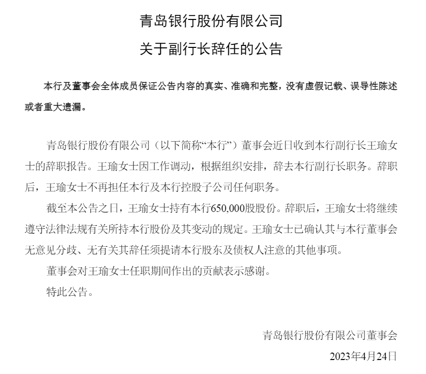 4月24日,青岛银行发布公告称,王瑜因工作调动,根据组织安排辞去副行长职务。补位人选同时公布,青岛银行董事会同意聘任张猛、张迟红为副行长,二者任职资格均需报监管核准。