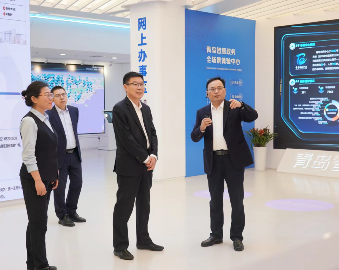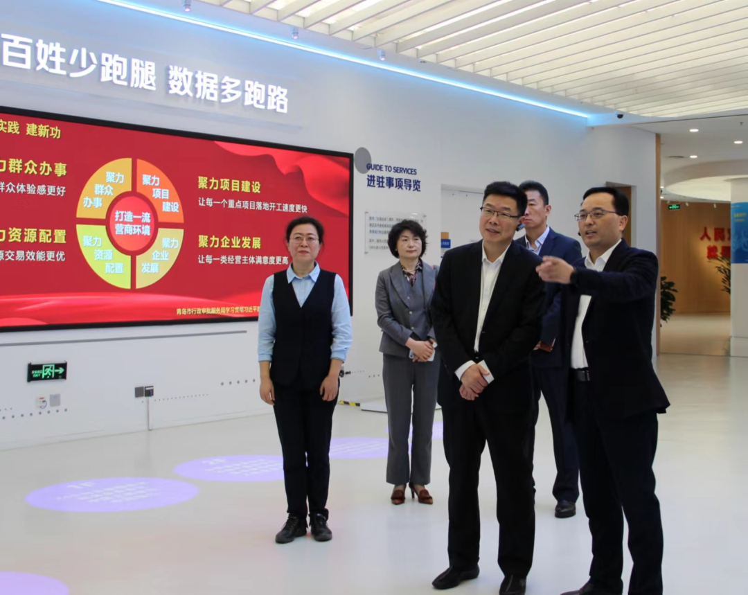 景在伦一行实地参观了青岛智慧政务全场景体验中心、党建文化长廊、市民会客厅、政务公开专区、重大项目审批服务专区、全国“人民满意的公务员”张大为工作室、公共资源交易大厅等,详细了解数字大厅建设、工程建设项目审批、企业开办和公共资源交易改革等工作开展情况。