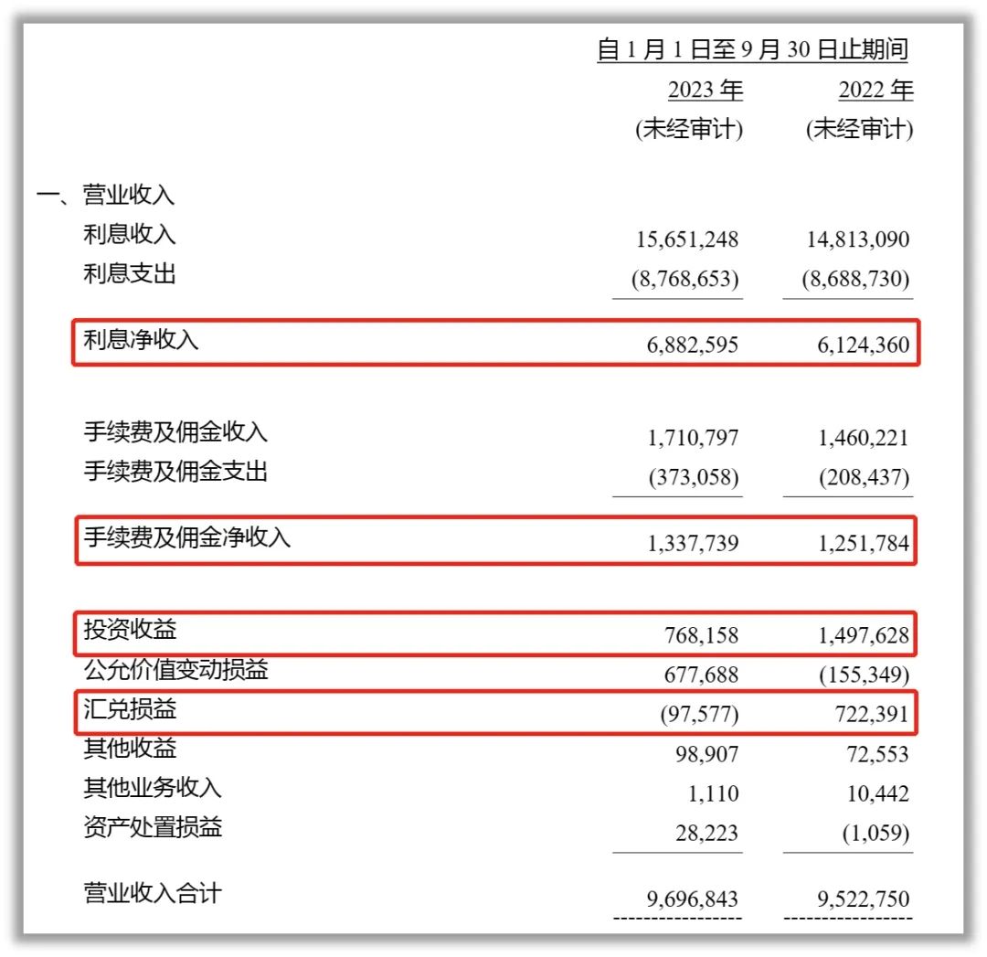 通过拆解青岛银行2023年三季报,可以看到去年前三季度青岛银行的利息净收入为68.83亿元,同比增长12.38%;手续费及佣金净收入为13.38亿元,同比增长6.87%。
