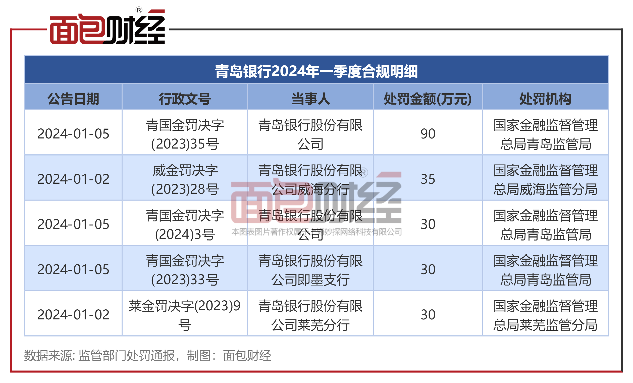 根据监管部门通报信息统计,2024年第一季度,涉及青岛银行及其分支机构的罚单有5张,罚没金额合计215万元。