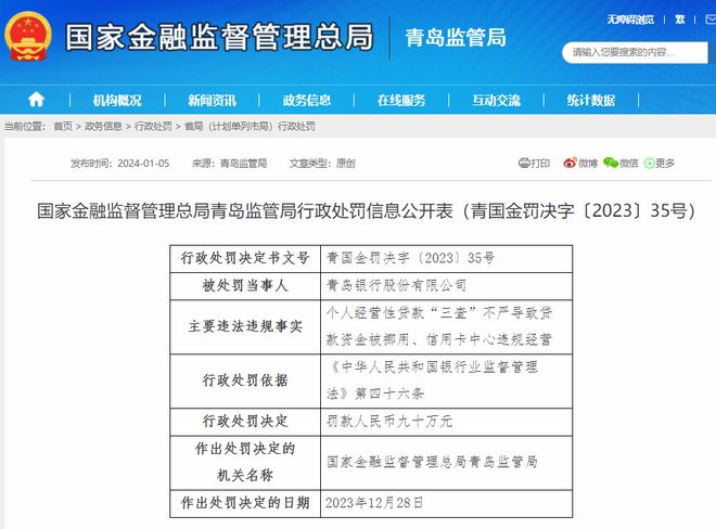 2024年1月5日,青岛银行被国家金融监督管理总局青岛监管局处以罚款90万元。行政处罚决定书文号为青国金罚决字〔2024〕35号,主要违法违规事实为个人经营性贷款“三查”不严导致贷款资金被挪用、信用卡中心违规经营。