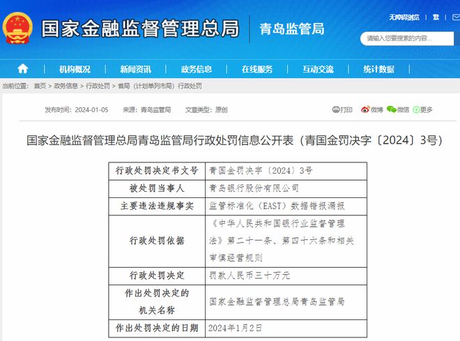 2024年1月5日,青岛银行被国家金融监督管理总局青岛监管局处以罚款30万元。行政处罚决定书文号为青国金罚决字〔2024〕3号,主要违法违规事实为监管标准化(EAST)数据错报漏报。