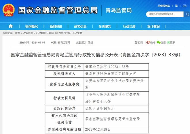 2024年1月5日,青岛银行被国家金融监督管理总局青岛监管局处以罚款30万元。行政处罚决定书文号为青国金罚决字〔2023〕33号,主要违法违规事实为向资本金不足的企业发放固定资产贷款。