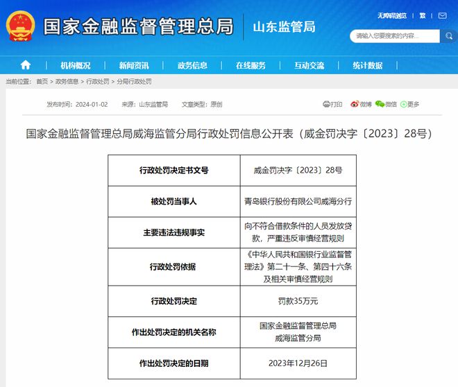2024年1月2日,青岛银行威海分行被国家金融监督管理总局威海监管分局处以罚款35万元。行政处罚决定书文号为威金罚决字〔2023〕28号,主要违法违规事实为向不符合借款条件的人员发放贷款,严重违反审慎经营规则。